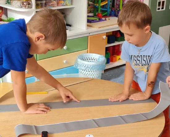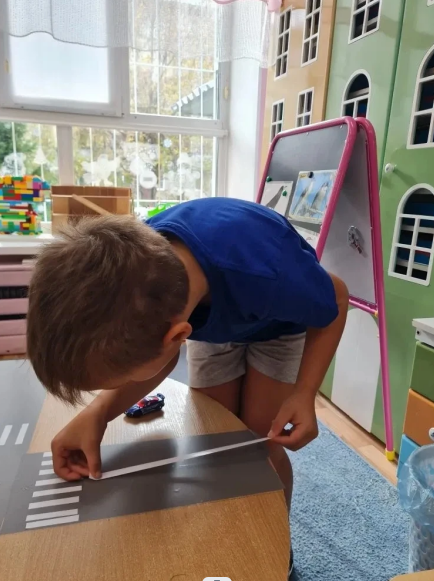 - Реята сами подготовили макет дороги, используя самоклеющуюся пленку, которую аккуратно приклеили на стол. Каждой детали уделили внимание, чтобы все выглядело как на настоящей дороге.